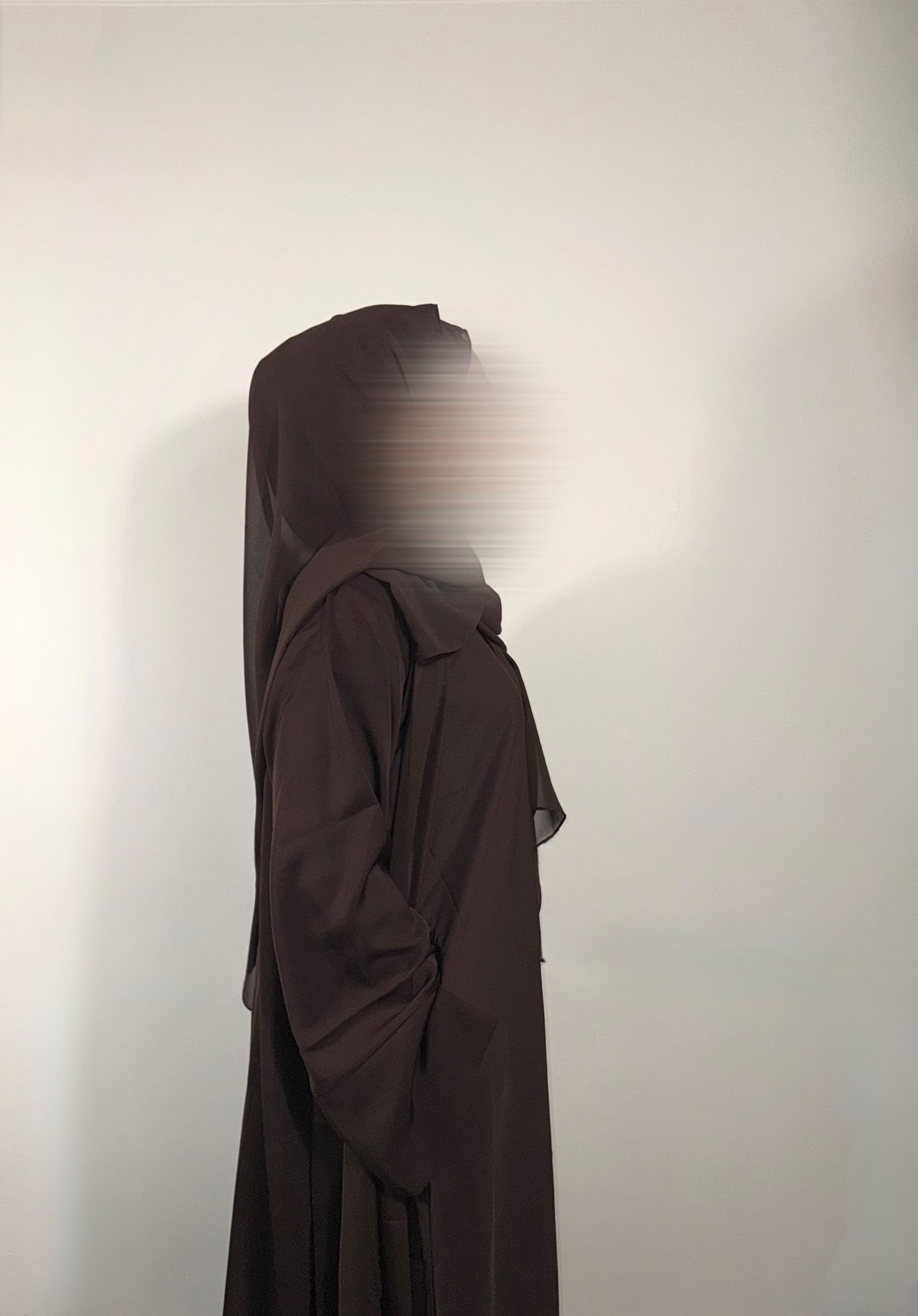comes with a nida outer abaya, an inner nida sleeveless abaya with pockets, and a matching printed chiffon hijab.
