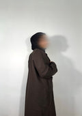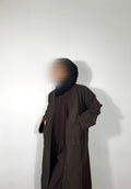 our coat abaya in espresso, made with a relaxed oversized fit, clean lines and practical side pockets made for effortless layering and everyday ease.